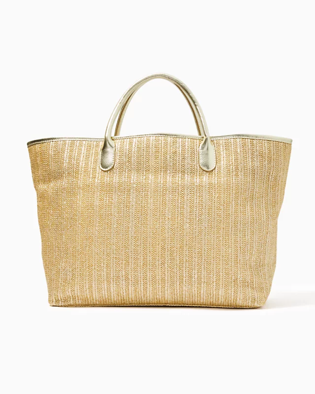 - Metallic straw tote with zipper closure and hanging fringed pineapple tassel.