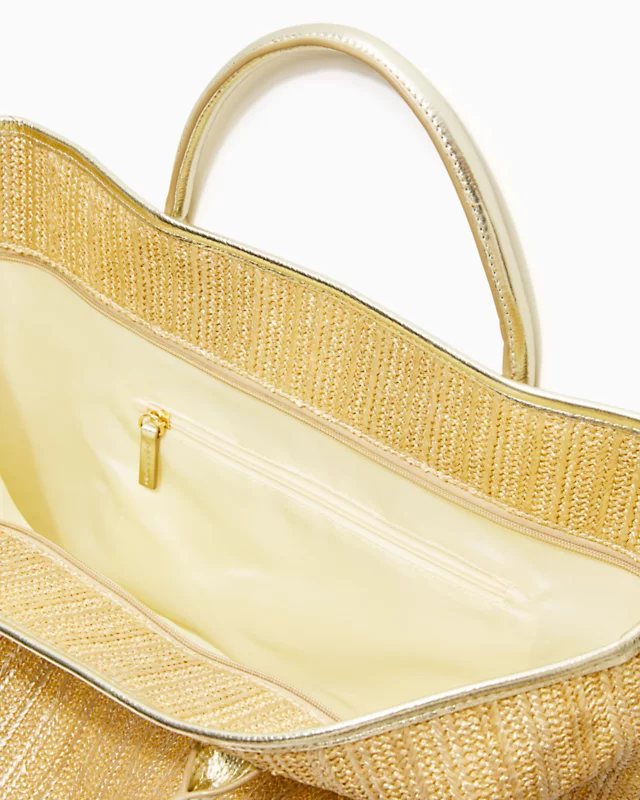Whether you’re spending a day poolside or have a full slate of errands ahead, take along this spacious tote made from metallic straw with a zip closure and pineapple fringe tassel.