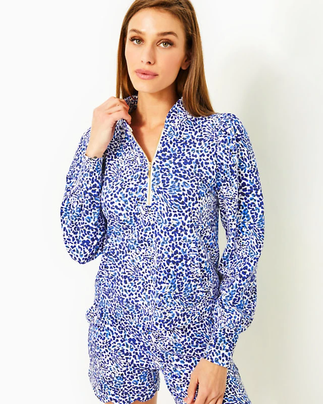 Soft and effortless in Luxe Terry, Cabello is the season’s prettiest popover. This straight fit style features a half-zip neckline, ruffled front pocket, stand-up collar, and full sleeves with shirred details. Lilly logo hardware makes a chic finishing touch.
