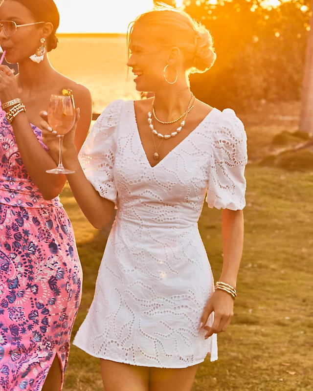 Intricate eyelet featuring a botanical design makes the Celestina Romper a crisp and elegant option for summer occasions. This skirted romper is finished with a V-neckline and short balloon sleeves.