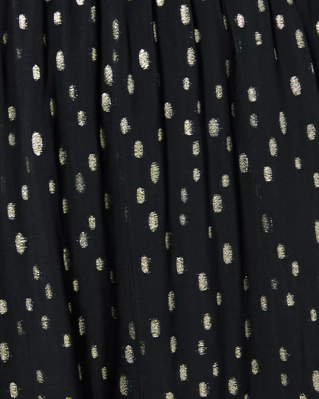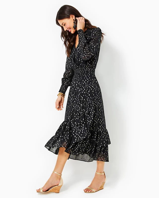 A ruffled skirt makes our Cristiana Midi Dress the season’s most romantic social style. Shimmering with metallic details, this easy fit midi offers a surplice neckline and long sleeves with smocked cuffs.
