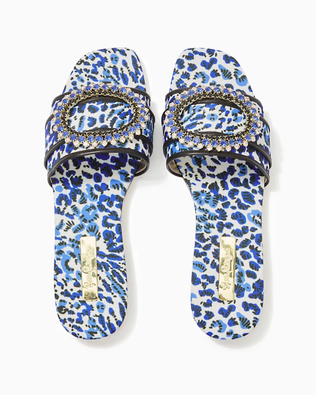 A glittering embellished buckle tops off the Dayna Sandal, a sleek slide in printed sateen.