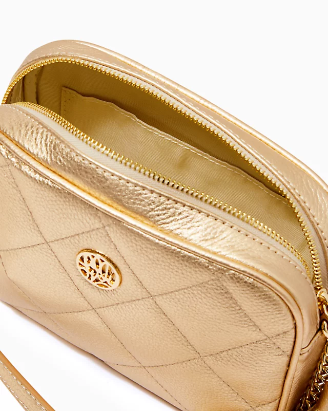 - Quilted gold shrunken crossbody with a gold metal chain.