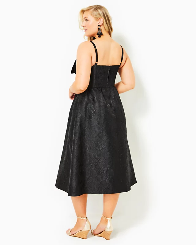 Textural jacquard and a dramatic bow detail at the bodice make the Ellara Dress our most elegant special occasion look. This fit-and-flare midi features a strappy sweetheart bodice, a smocked back, and side seam pockets.