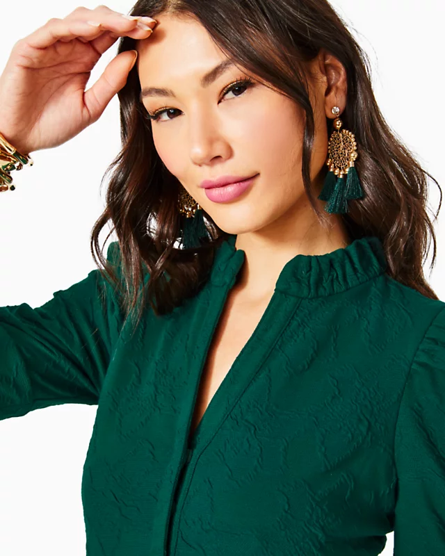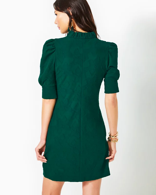 Custom color jacquard lends subtle texture to our perfectly polished Elsey Dress. This straight fit popover style features a ruffle collar, half placket, and elbow-length puff sleeves for a playful finishing touch.