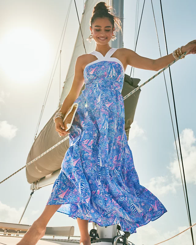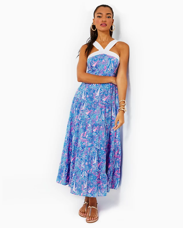 A contrast halter neckline adds a face-framing pop to our Jenette Dress, an ankle-length maxi made from printed cotton cambric. This fit-and-flare style features a smocked back panel and tiered skirt with handy side seam pockets.