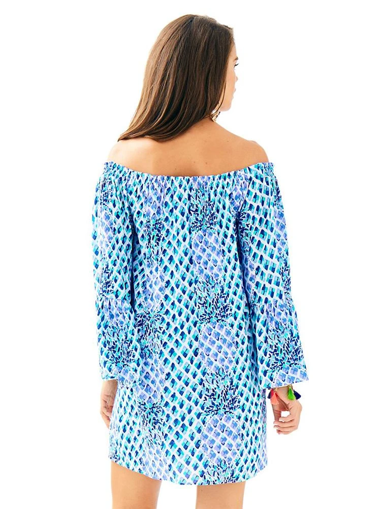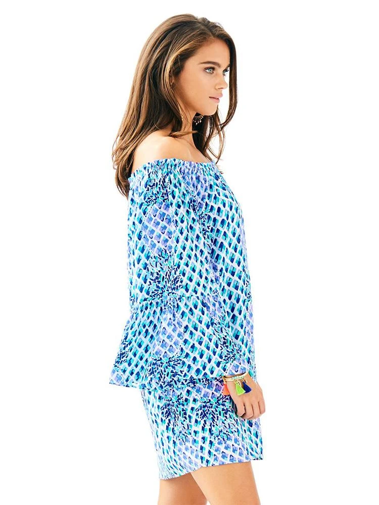 The Nevie Dress is a gorgeous off the shoulder, pull on dress with flounce sleeves. Pair this printed beauty with gold wedges and accessories for a fun party look.