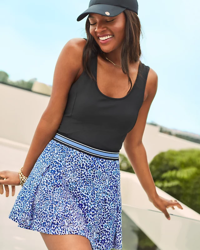 The Pineapple Park Romper is a chic Luxletic® style in rib knit fabric, topped off by a stretch woven skirt. Front pockets and an attached undershort complete the look.