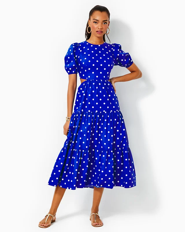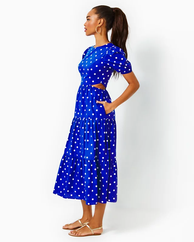 Cutout details at the waist add an unexpected wink to the Lyssa Dress, a lightweight cotton poplin midi with full sleeves and a tiered skirt. We also added one of our favorite accents: pockets!