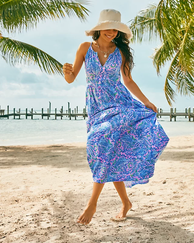 - Ankle length, swing fit, tiered maxi with a halter neckline and side seam pockets.