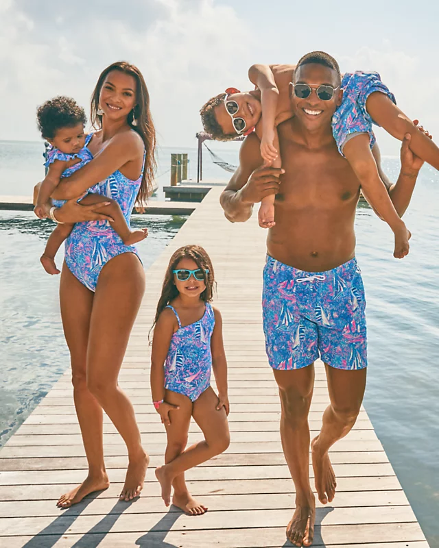 Dress the whole family in Lilly and dive in! He’ll love these printed nylon boxer-style swim trunks with a 6″ inseam, elastic drawstring waist, and mesh liner.