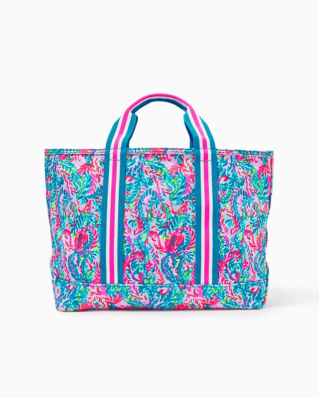 - Mini printed zip top canvas beach tote with striped webbing detail.