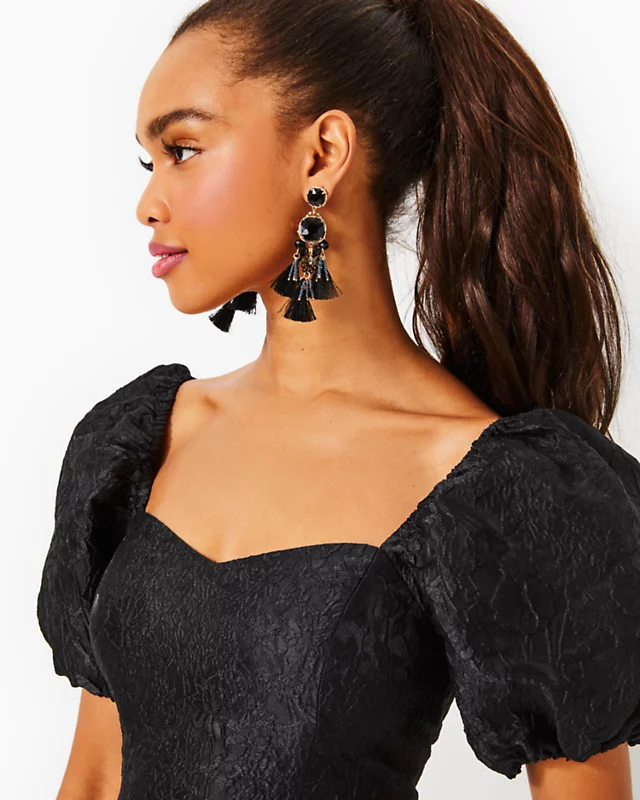 Made from textural jacquard, the Morena Romper is a skirted style with short puff sleeves, a sweetheart neckline, and a smocked back.