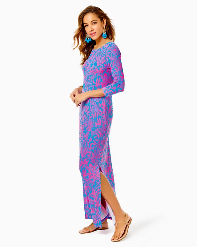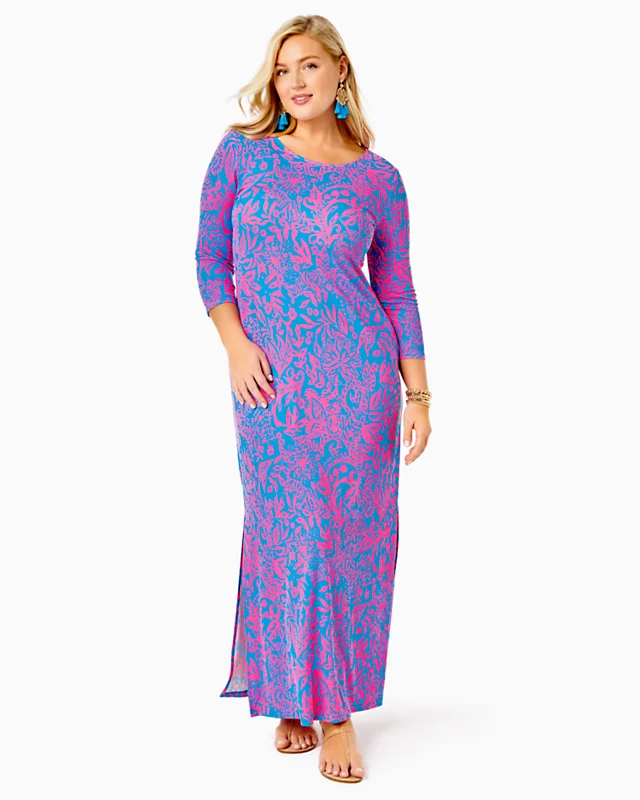 Our Morgann Maxi Dress is a showstopping style, made from soft jersey fabric and wrapped in head-to-toe print. This ankle-length design features a straight fit, crew neckline, 3/4-length fitted sleeves, and side slits.