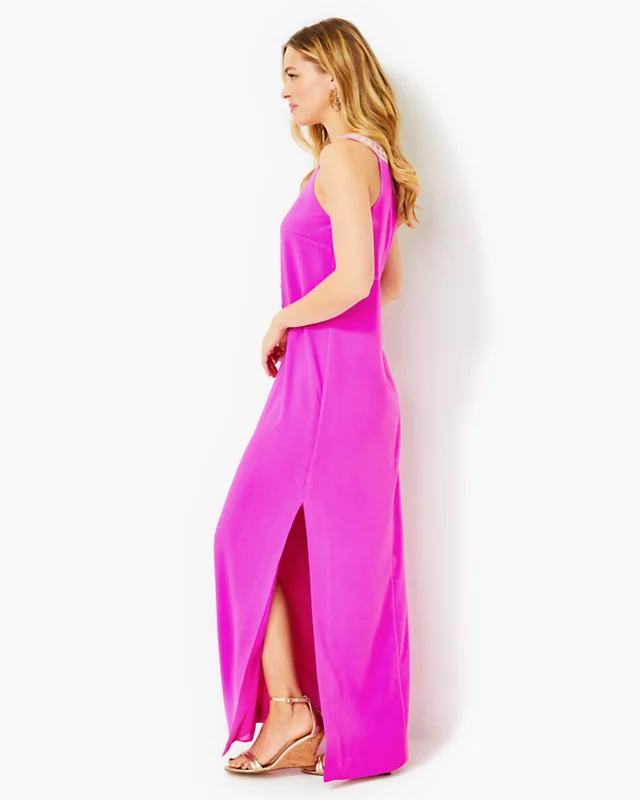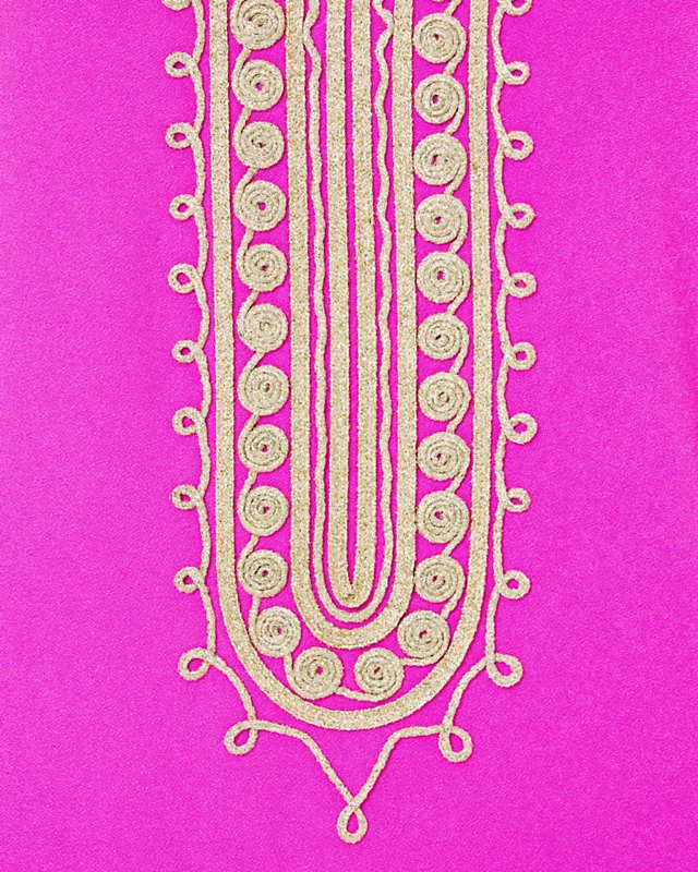 Make a colorful statement in the Sandra Dress, an elegant maxi shift trimmed in gold soutache. We love this flats-length design for its easy fit, completed by a notch neckline and side slits.
