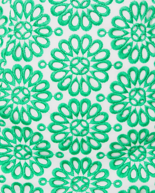 Oversized pinwheel eyelet makes a boldly patterned statement atop the Shelli Eyelet Romper. This fitted, strappy style features a tie back detail and bodice cups.