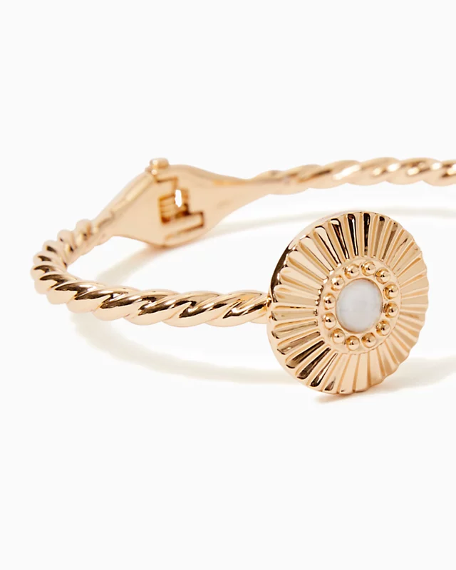 Sunburst endcaps top off this textured gold bangle bracelet.